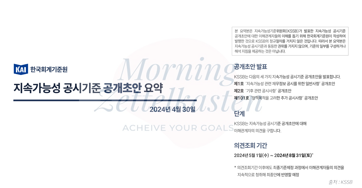 안녕하세요.Morningzettelkasten입니다. 이번 포스팅에서는 지난 KAI Forum : 지속가능성 공시기준 제2호 기후공시 Part 1 포스팅에 이어 핵심요소 4. 지표 및 목표의 온실가스 배출량 공시 요구사항에 대해서 중점적으로 안내드리도록 하겠습니다. 연결 실체로의 세분화 공시와 측정방법별 세분화 공시 등의 지속가능성 공시기준 제2호 기후공시에서 안내하고 있는 온실가스 배출량 공시 요구사항에 대해서 확인해보시기 바랍니다. [KAI Forum : 지속가능성 공시기준 제1호 일반사항] 지속가능성 공시기준서 제1호 기준서 구성 주요 5대 개념적 기반 일반요구사항 및 ISSB 국제 기준과의 비교 KAI Forum : 지속가능성 공시기준 제1호 일반사항안녕하세요.Morningzettelk..