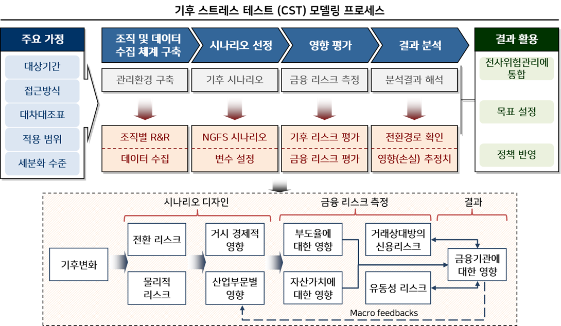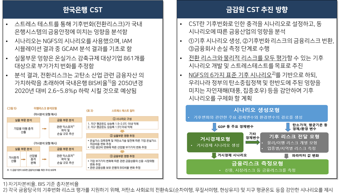 글로벌 중앙은행 및 최근 한국은행에서도 국내 금융기관들의 기후리스크 평가를 위한 통합 기후 스트레스 테스트(Climate Stress Test)를 수행한 바 있으며, 한국 금감원은 이행 리스크와 물리적 리스크를 모두 평가할 수 있는 기후 시나리오 개발 및 스트레스테스트를 국내 은행 및 보험사에 적용할 예정이라고 밝힌 바 있습니다.