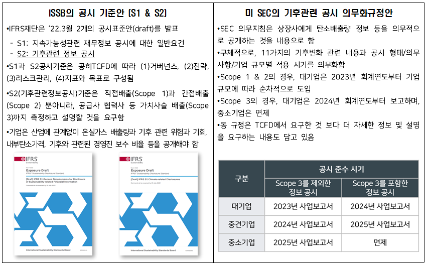 최근 2030 NDC 상향 및 ESG 탄소 배출량 공개 의무화 국제동향에 따라 생산품의 공급망까지 ESG 경영 요구가 확대되고 있는 상황입니다. 특히, IFRS재단의 ‘국제 지속가능성 표준위원회’(ISSB)에서 지난해 3월 발표한 S2(기후관련정보공시안)와 SEC의 기후관련 공시 의무화규정은 Scope 3의 공시를 대기업에게 요구하고 있습니다.
