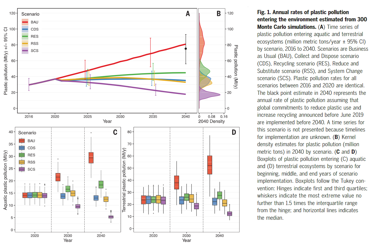 연구진들은 이 복잡한 문제를 수치화하기 위해 전 세계 플라스틱의 생산과 사용, 폐기를 추적했다. 그들은 이를 바탕으로 한 플라스틱 오염 예측 모델을 만들었고, 플라스틱 생산과 증가 추세, 재사용 및 재활용량의 큰 변화가 없는 현재 상태를 기반으로 한 '정상적 비즈니스 시나리오(아래 그래프 BAU(Businessas Usual) 부분 참고)'에선 향후 20년 안에 13억 톤의 플라스틱 쓰레기가 발생할 것으로 예측했습니다.