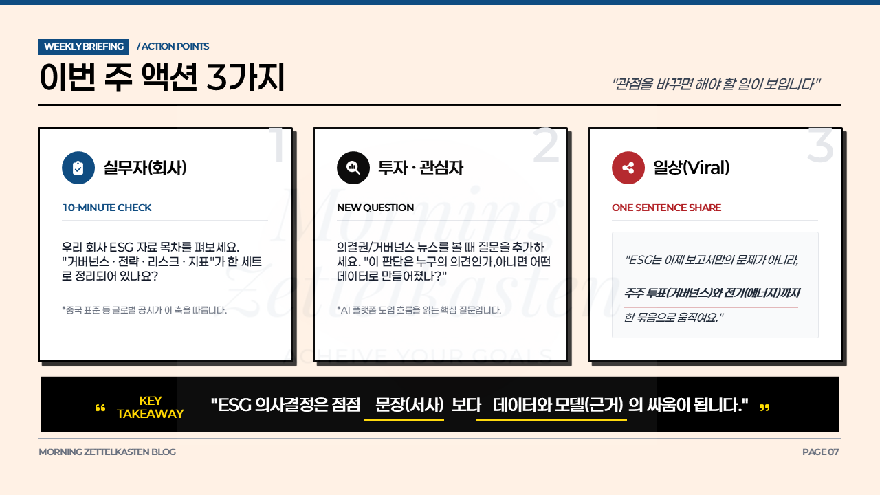 - 이번 주 1순위는 "공시·거버넌스·전력"을 따로 보지 않고 한 묶음으로 관리하는 능력입니다.