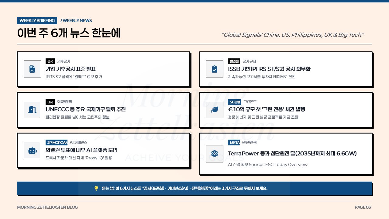중국·필리핀의 기후공시 표준화, JP Morgan의 AI 의결권 플랫폼, Meta의 원전 전력 확보 전략까지.