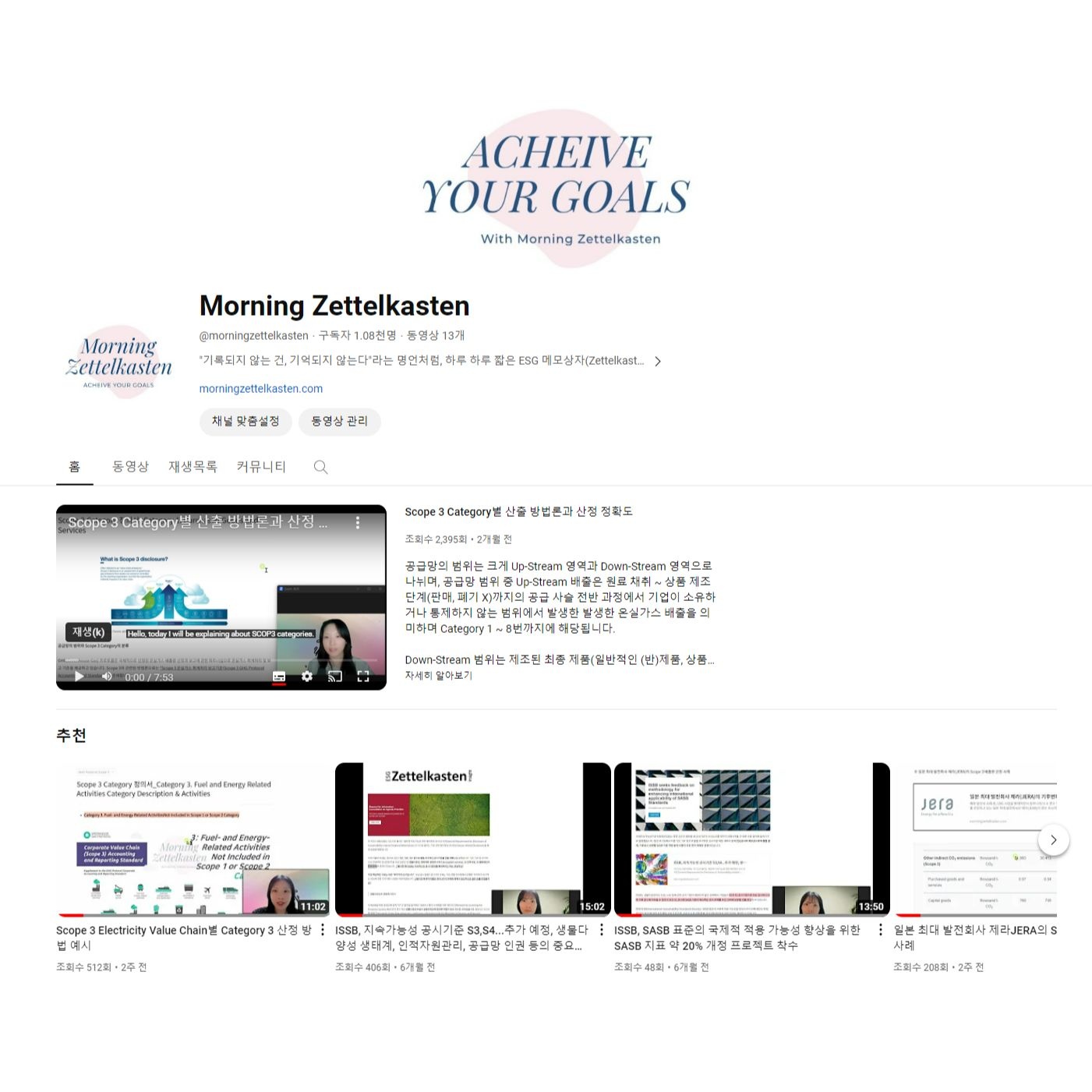 이처럼 사이드프로젝트(Sideproject)는 거창한 것 아닌, 본업이 아닌 다른 일을 진행하면서 그게 돈이나 성과보다 ‘내가 정말 하고 싶은 일’을 실현하고 실험하는 것에 중점을 둔다면 자연히 사이드프로젝트(Sideproject)가 될 수 있게 됩니다. 저 역시 이 부분에 중점을 두었고 2022년 10월 이후 37개의 ESG 관련 지식 공유 글을 작성하였으며, 작성한 글을 바탕으로 YouTube 채널을 개설하여 13개의 동영상 제작을 통해 2023.12.26일 현재 1,080 여 명의 구독자를 보유한 Creator로 성장할 수 있었습니다.