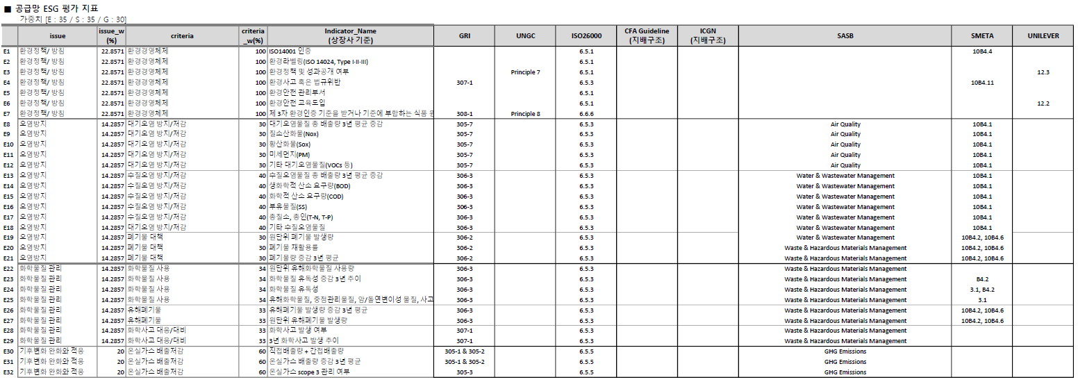ESG 평가 및 관리를 위한 지표 선정에 있어서 꼭 놓쳐서는 안될 부분은 다양한 글로벌 프레임워크에서 중요하게 다루고 있는 지표들을 정리하여 해당 산업에서 의미가 있는 지표들을 결정해야 한다는 점입니다. 주요 글로벌 프레임워크에는 GRI, ISO 26000, SCM, RBA, SMETA, SASB 등이 있으며 향후 지속가능성 관리 측면에서는 Taxonomy를 검토하기를 추천드립니다.