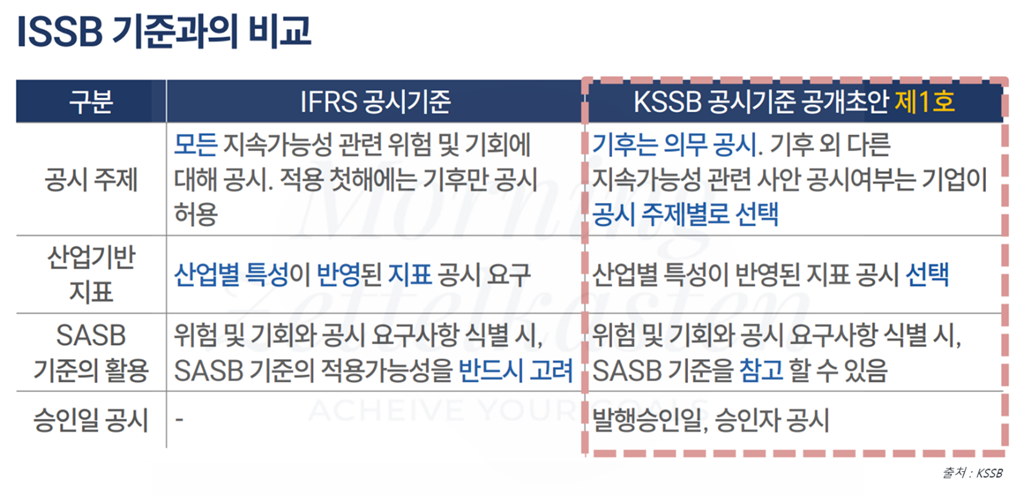 또한, 산업기반 지표와 SASB 기준 적용의 경우 KSSB 공시기준 공개초안에서는 기업의 선택권을 부여한 반면 ISSB의 IFRS 공시기준에서는 산업기반 지표를 공시하도록 요구하고 있으며, SASB 기준 활용도 반드시 고려하도록 요구하고 있습니다.