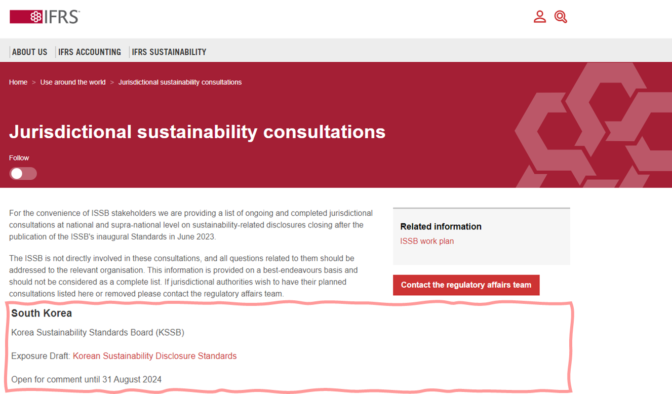IFRS Foundation 웹사이트에 공지된 한국지속가능성기준위원회(KSSB)의 지속가능성 공시 협의서 발간 내용