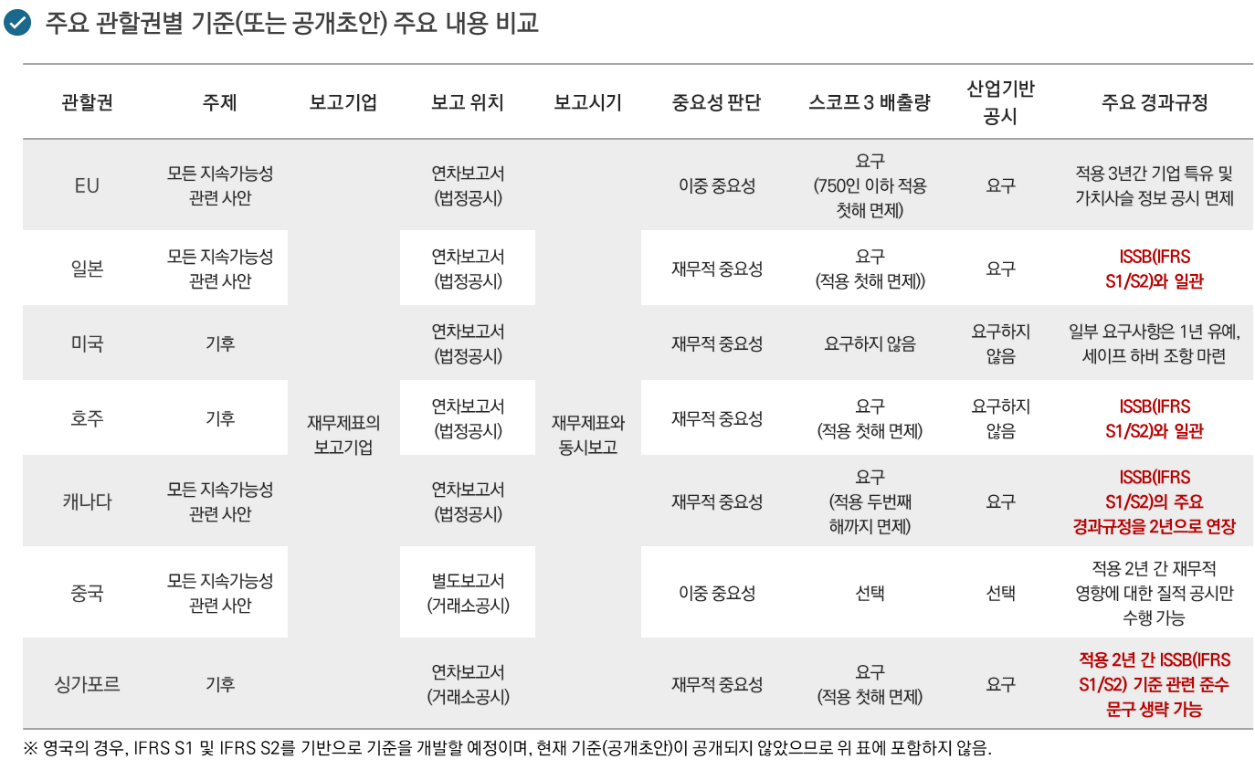 KSSB는 공시기준 공개초안 개발에 있어 글로벌 기준선인 IFRS 지속가능성 공시기준을 국내 기준 제정의 시작점으로 해외의 주요 기준제정기구와의 회의를 진행하는 등 국제 동향에 대한 모니터링 및 분석을 수행하여 이를 공시기준 공개초안 개발 시 참고 적용하였음을 밝혔습니다.( 국내 지속가능성 공시기준 공개초안)
