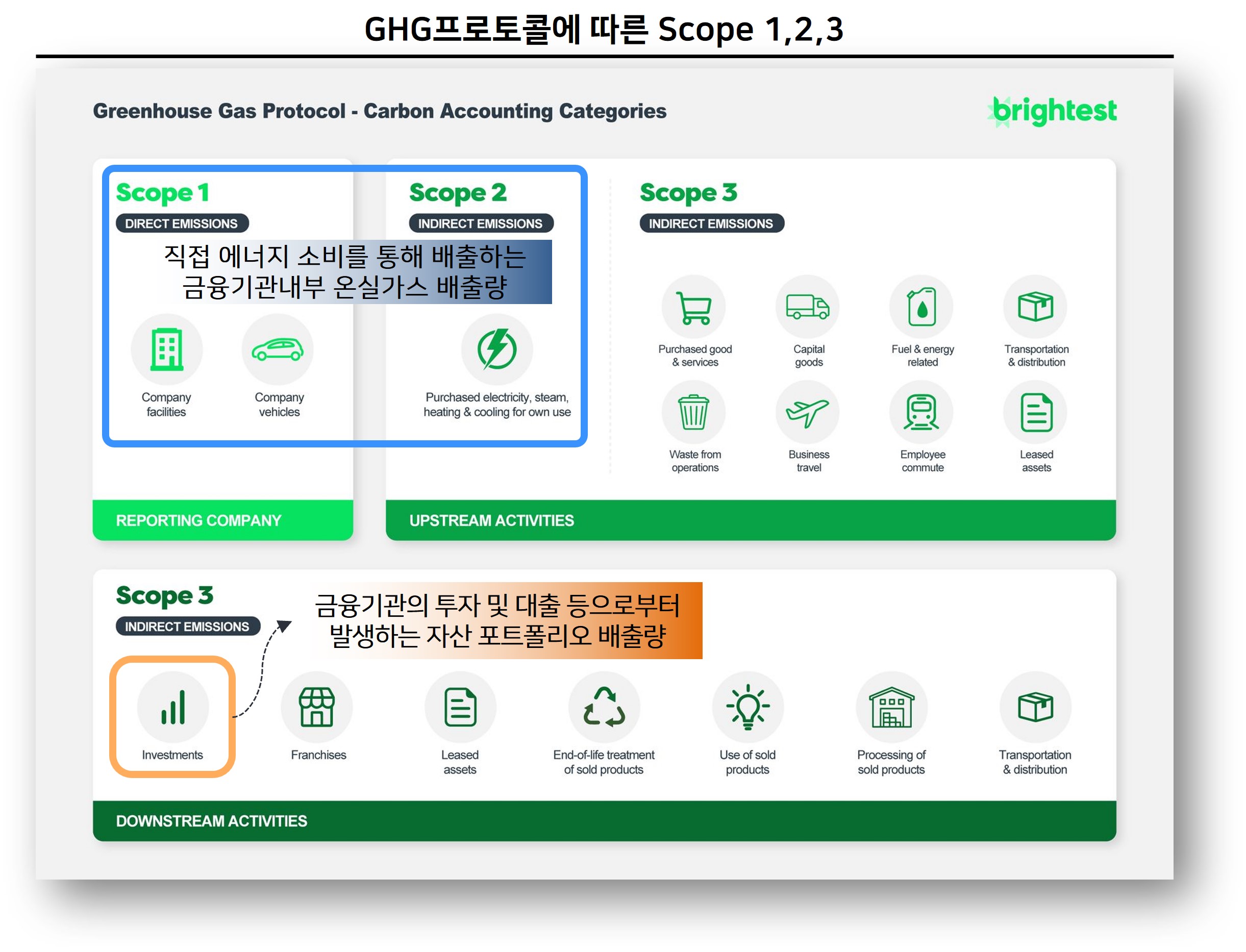 은행, 보험, 자산운용사 등 모든 금융 부문별로 넷 제로 금융이니셔티브들이 만들어지고 있습니다. 이니셔티브에서는 금융기관의 투자 또는 대출 기업이 배출한 온실가스인 금융 배출량 관리를 의무화하고 있고, 금융 배출량은 Sope3의 15개 카테고리 가운데 마지막인 '투자' 카테고리에 해당됩니다.
