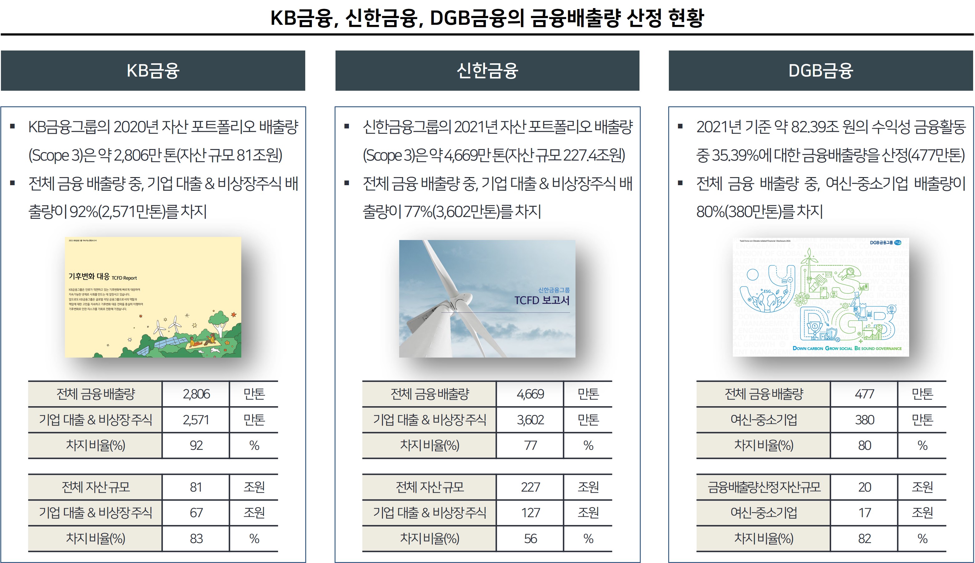 물론, 한계점도 존재합니다. PCAF 이니셔티브에 참여하고 있는 국내 12곳 금융기관 중 포트폴리오에 따른 금융배출량을 TCFD 보고서를 통해 공시한 기관은 3곳에 불과하다는 점과 배출량 공시와 더불어, PCAF 가이드라인(6. 공시 권고사항 및 요구사항)에서 중요시 하는 요구사항인 원단위 배출 집약도와 부문(asset class & sector)별 Data Score 평균화 부분의 공시가 제대로 반영되고 있지 않다는 점입니다. 현재로서는 금융배출량을 산정하기에도 벅찬 상황이기 때문입니다.