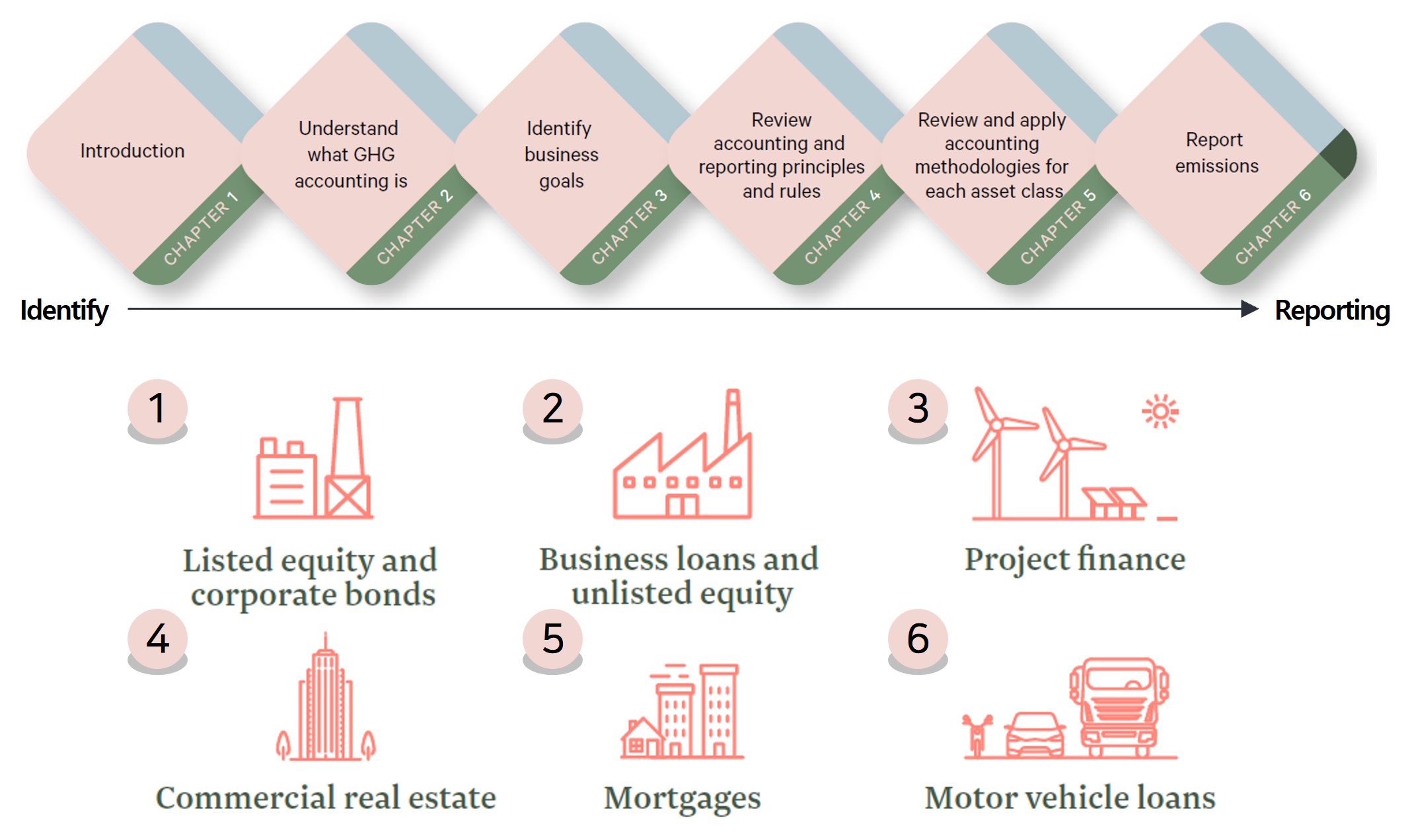 PCAF는 다음 6개의 자산군(asset classes)에 대한 방법론을 제공합니다.