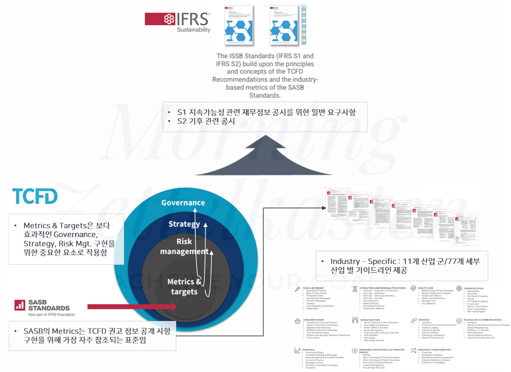 ISSB는 지속가능성 공개 에코시스템의 투명성 및 간소화에 대한 요구에 직접 대응하기 위해 TCFD의 권고사항과 SASB 프레임워크의 산업 기반 요구사항을 기반으로 합니다. ISSB는 IFRS 지속 가능성 공개 표준이 SASB 표준을 대체할 때까지 공시 준비자와 투자자가 SASB 표준에 대한 전폭적인 지원과 사용을 계속할 것을 권장합니다.