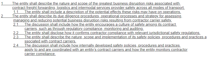 - BASIC은 개정 접근법 4를 사용하여 IF-WM-320a.2, TR-AF-540a.4 및 TR-RO-540a.2 지표를 제거해야 했던 동일한 데이터베이스 도구이지만, 이러한 예에서는 제거 후에도 다른 유사한 지표가 남아 공개 주제를 뒷받침함. 새로운 정성적 지표 TR-AF-430a.3은 기업이 공급망 중단을 방지하기 위해 모든 운송 수단에서 계약 운송업체의 안전을 관리하는 방법에 대한 정보를 제공하도록 요구함.