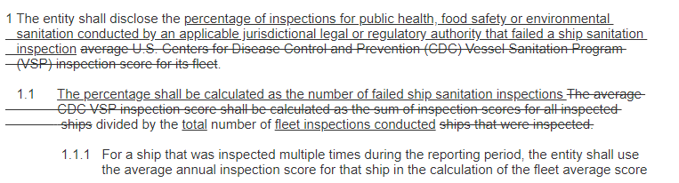 | - 크루즈선 업계의 Example 4는 메트릭 TR-CL-250a.2를 통해 선박 위생 점검을 검토함. - 해당 공시 지표는 미국 질병통제예방센터(CDC)에서 관리하는 특정 프로그램을 참조함. - 해당 검사 프로그램은 미국 해역에서 운항하는 선박에만 적용되는 것은 아니지만, 선박 위생 검사 제도는 관할권 규정마다 크게 다를 수 있음. - 일부 검사제도는 단순한 합격 또는 불합격으로 선박 인증을 제공하기도 하지만, 수치로 스코어를 매기기도 함, 따라서 관할권마다 선박 위생검사 제도에 대한 중요 항목과 항목별 적용되는 가중치가 상이할 수 있음. - 이에, 개정된 지표에서는 검사 점수 값에 대한 언급은 삭제되었으며 대신 전반적인 검사 결과에 중점을 두어 다양한 관할권에서 사업을 운영하는 법인에 적용할 수 있고 투자자에게 의사 결정에 유용한 정보를 제공할 수 있도록 개정된 지표를 적용함. - 또한, 해당 개정안은 적용 가능성을 높여 더 많은 법인이 해당 지표를 통해 선박 위생에 관한 정보를 제공할 수 있도록 함으로써 관할권별 검사 체계에 관계없이 관할권 간의 비교 가능성을 높였음. |