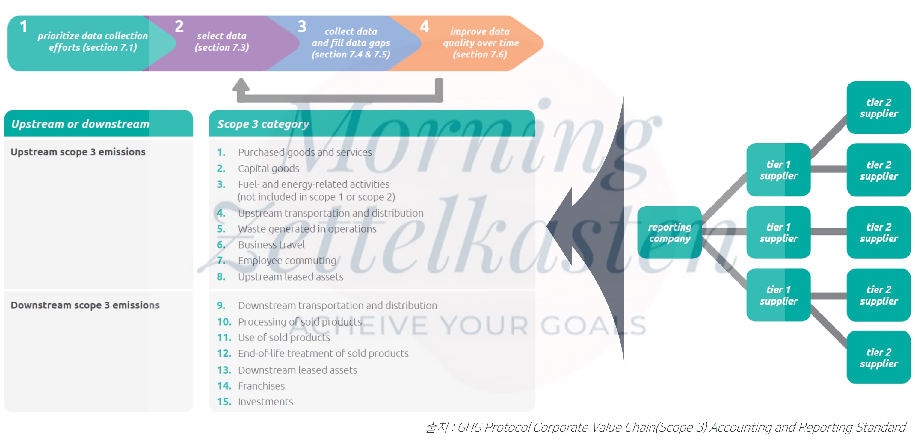온실가스 배출 및 기후 변화와 관련된 기업의 영향, 위험 및 기회는 직접적인 운영뿐만 아니라 업스트림(Upstream) 및 다운스트림(Downstream) 영향에 따라 달라집니다. 기업이 기후 관련 영향, 위험 및 기회를 이해하고 관리할 수 있으려면 Scope 1&2와 더불어 Scope 3 배출 범위에 걸친 완전한 GHG 인벤토리가 필수적이라고 할 수 있습니다.
