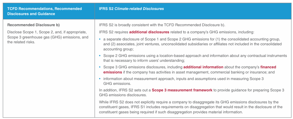 IFRS S2의 요구사항은 약간의 차이점을 제외하고 TCFD의 4가지 핵심 권고사항과 11가지 권장 공시를 통합하고 일관성을 유지하였습니다. IFRS S2-TCFD 비교 표에는 IFRS S2와 TCFD 권고사항 간의 차이점이 요약되어 있습니다. 표에서 볼 수 있듯이 IFRS 지속가능성 공시 기준을 적용하는 기업은 TCFD 권고사항(및 그 이상)을 충족하게 되어 기업은 IFRS 지속가능성 공시 기준과 더불어 TCFD 권고사항을 추가로 적용할 필요가 없게 됩니다.