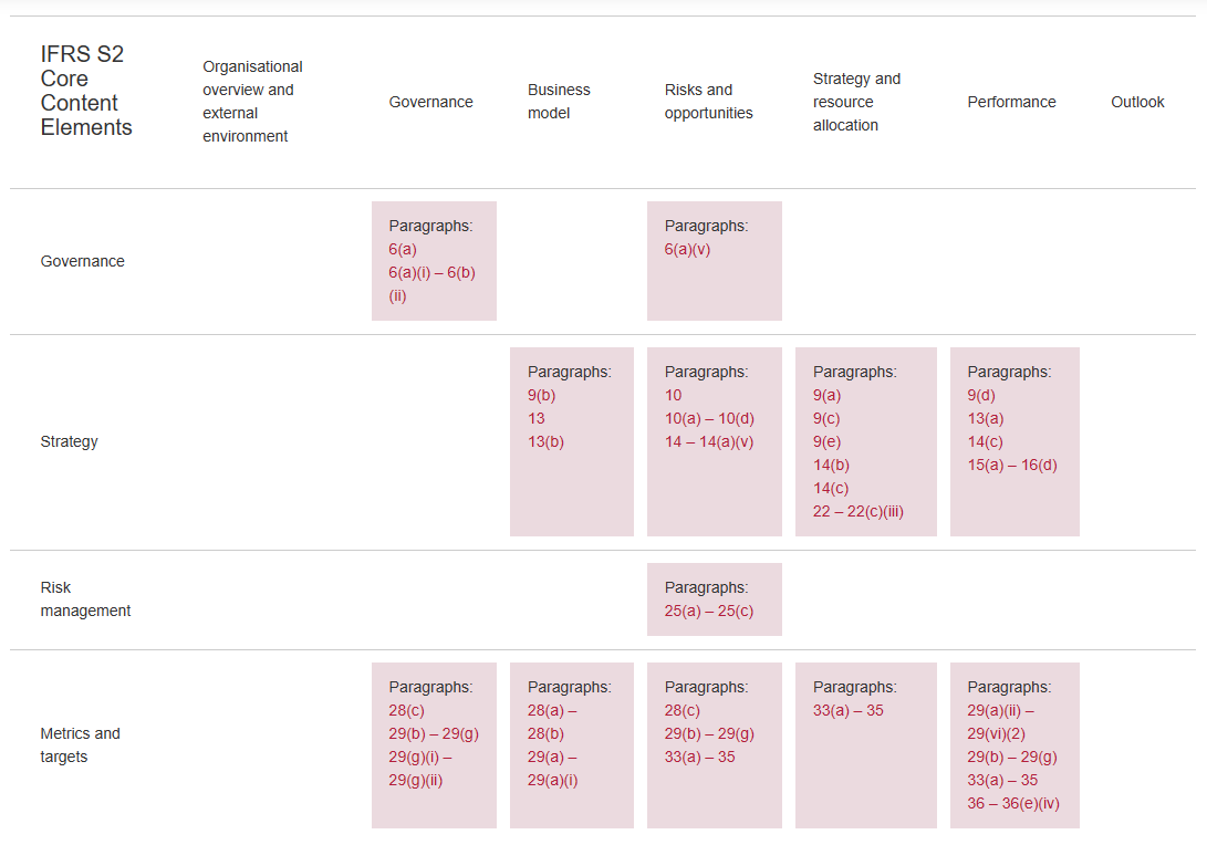 IFRS S2의 요구사항은 약간의 차이점을 제외하고 TCFD의 4가지 핵심 권고사항과 11가지 권장 공시를 통합하고 일관성을 유지하였습니다. IFRS S2-TCFD 비교 표에는 IFRS S2와 TCFD 권고사항 간의 차이점이 요약되어 있습니다. 표에서 볼 수 있듯이 IFRS 지속가능성 공시 기준을 적용하는 기업은 TCFD 권고사항(및 그 이상)을 충족하게 되어 기업은 IFRS 지속가능성 공시 기준과 더불어 TCFD 권고사항을 추가로 적용할 필요가 없게 됩니다.