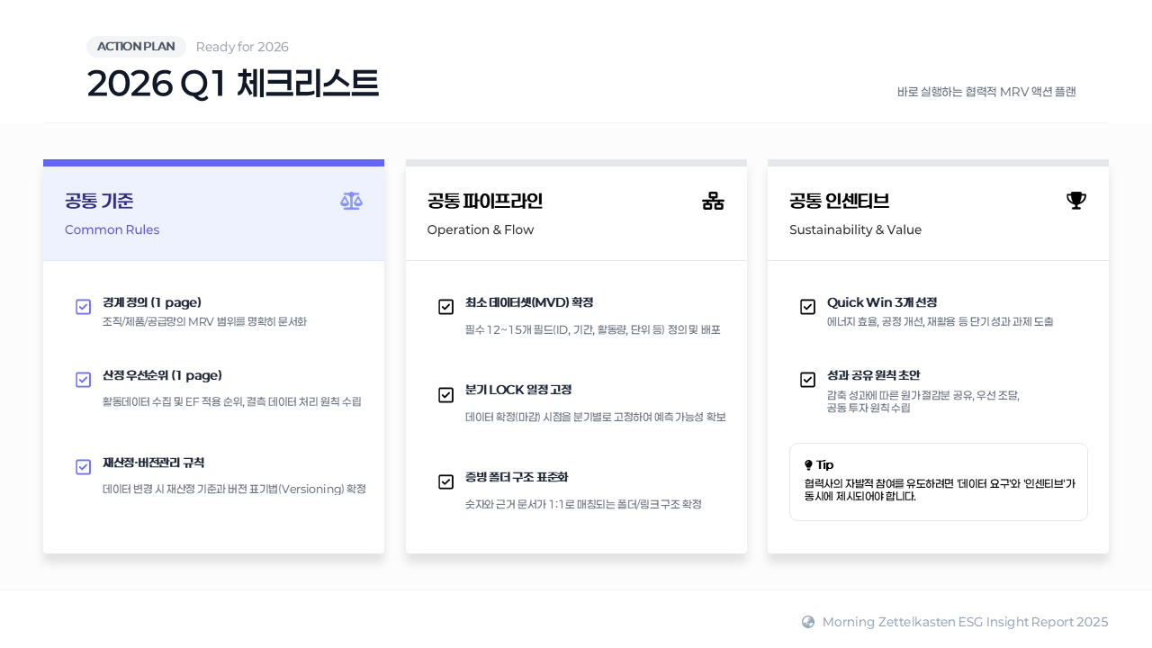 - 협력적 MRV 액션: 2026년은 '돈 나갈 준비'를 하는 해입니다. 분기별 운영 리듬을 설계하고, 계산 로직(산식/계수/경계)의 버전을 관리하여 2027년 정산 시의 혼선을 원천 차단해야 합니다.
