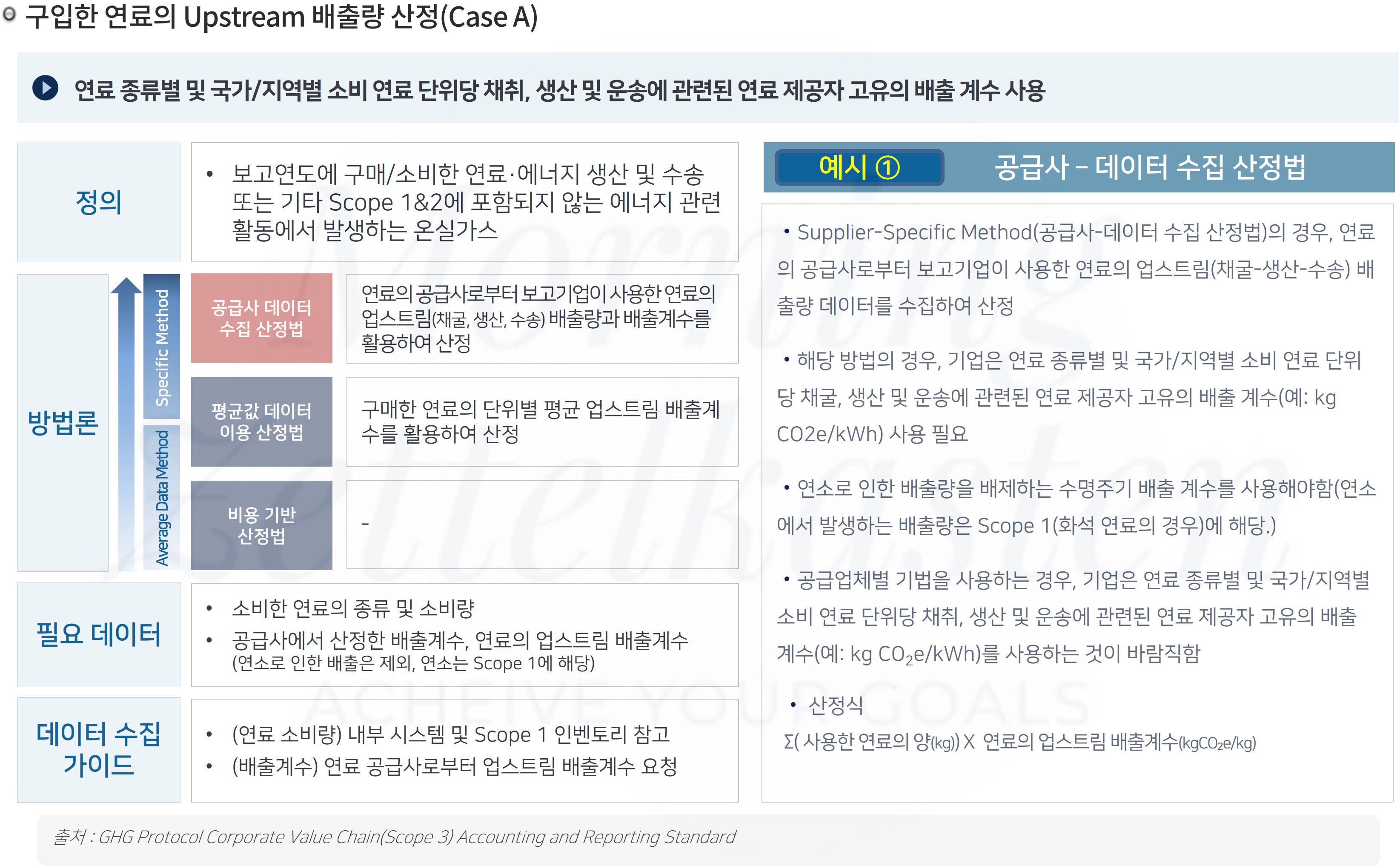 - ①공급사 데이터 수집 산정법(Supplier-Specific Method)의 경우, 연료의 공급사로부터 보고기업이 사용한 연료의 업스트림(채굴-생산-수송) 배출량 데이터를 수집하여 산정함을 의미하며,