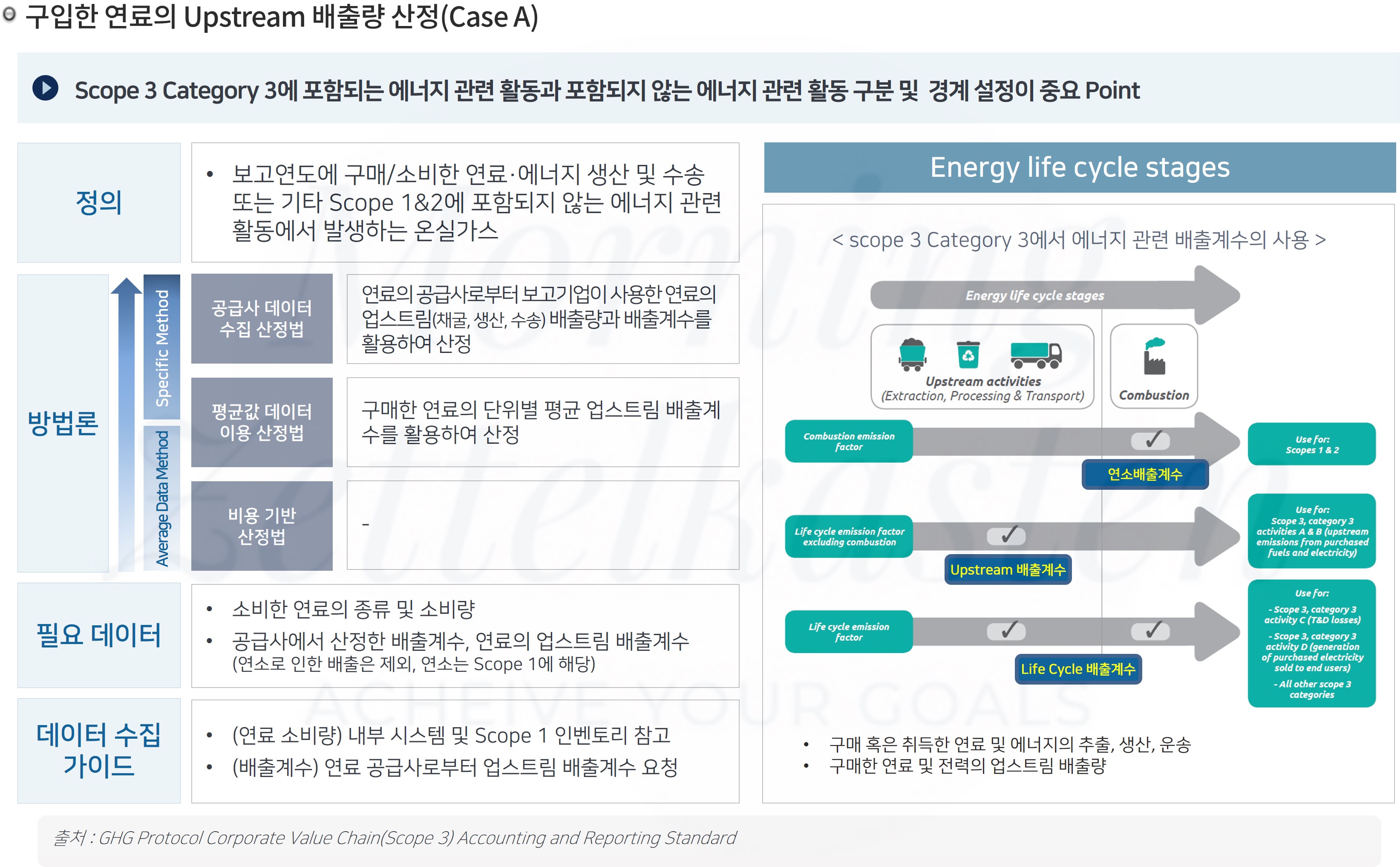 - 이 중, 구입한 연료의 Ustream 배출량 산정 - Case A번은 "Energy life cycle stages" 배출계수 ②번(Upstream 배출계수)으로 분류됩니다.